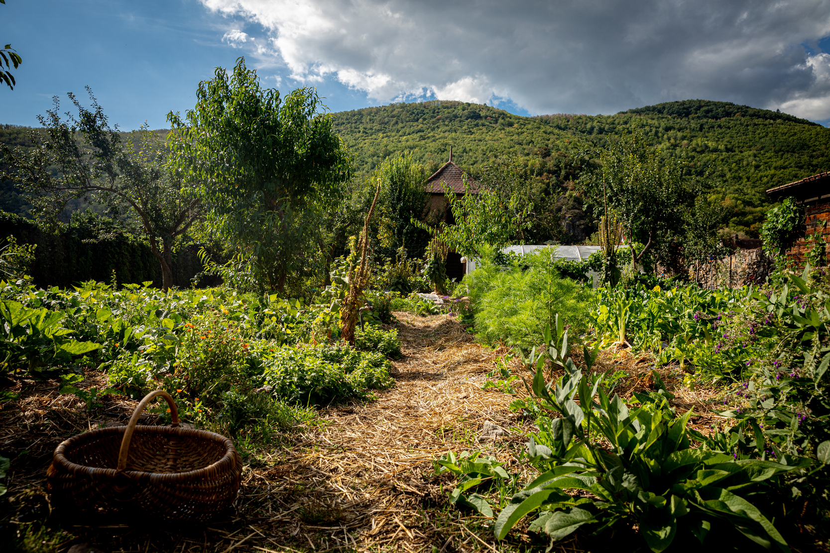 Accroché à flanc de montagne, ce jardin est installé chez Jérôme & Marie-Laure. Ici, le geste est direct, le rythme est simple : on cueille les aromatiques dès l’aube, on ne court pas dans tous les sens. Une petite serre permet d’y faire pousser tomates, herbes fraîches et plantes délicates. C’est le jardin du quotidien, intime & calme.